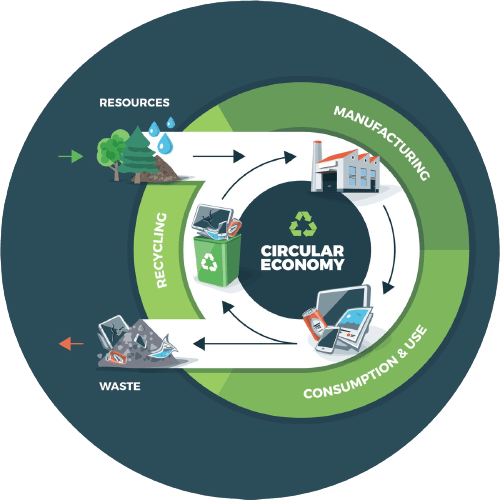 På billedet kan du se hele livscyklussen for den cirkulære økonomi, hvor vi nøje undersøger hvert trin – både brugen af ressourcer i produktionen, produktet ud til forbrugerne, samt hvordan spildet efter forbruget kan genbruges. Det er vores Greenpallets et stærkt eksempel på.